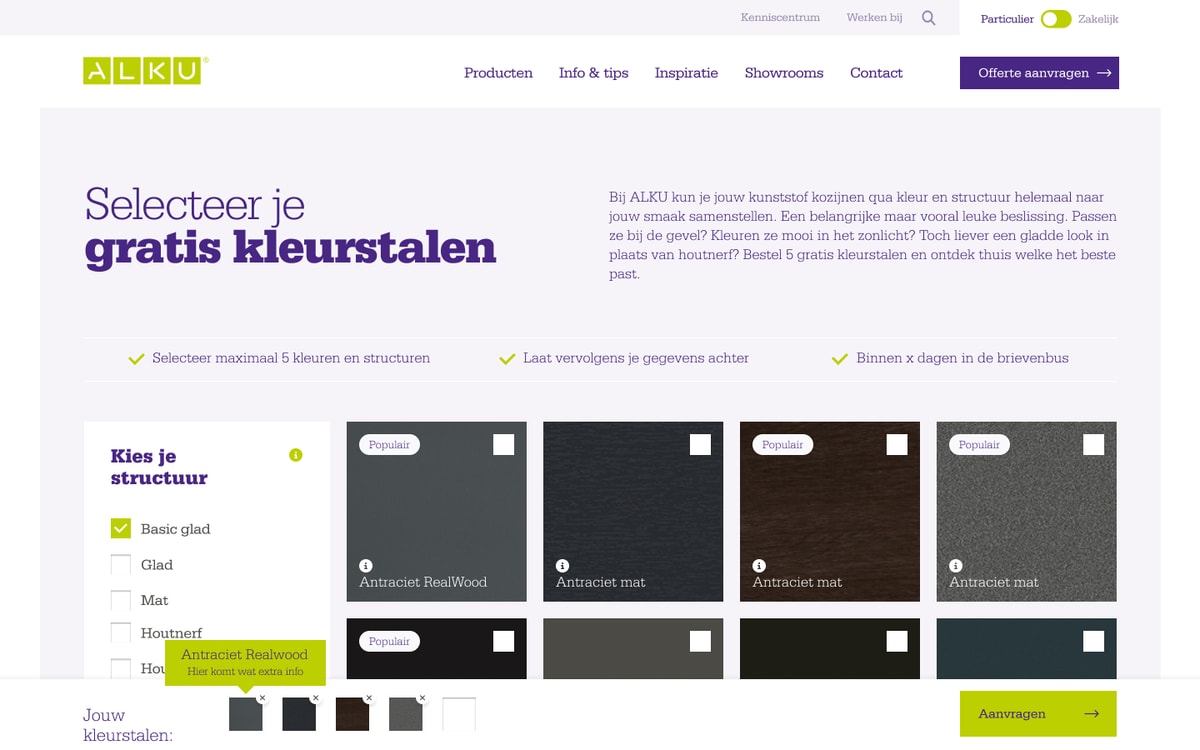 Samen met ALKU ontwikkelden we een volledig redesign. Een scherpe positionering en branding die staat als een huis. Hoewel ALKU geen webshop is, zorgt een op maat gemaakte productconfigurator ervoor dat bezoekers toch hun ideale product kunnen samenstellen. Wij bouwden een geïntegreerde koppeling met HubSpot, zodat het marketing team van ALKU direct met geautomatiseerde e-mailflows een opvolging kan doen. En om de website continu te blijven verbeteren, werken we met maandelijkse sprints om de website steeds een beetje beter, sneller én converterender te maken.