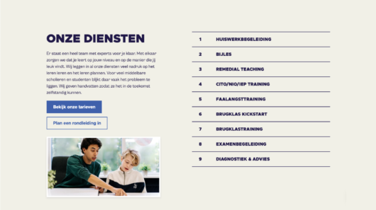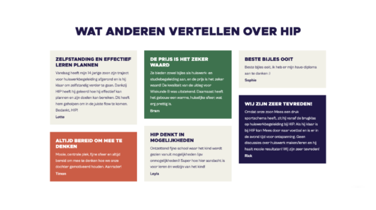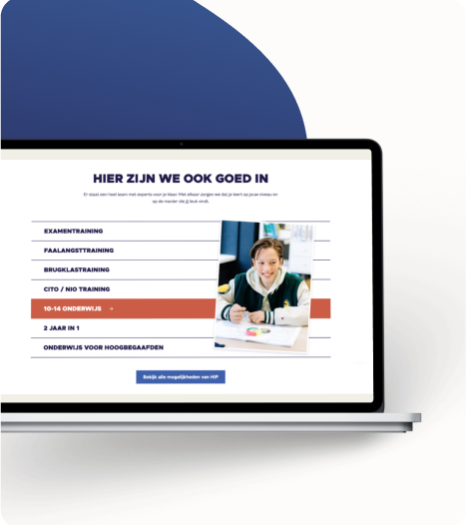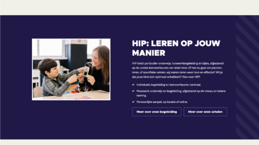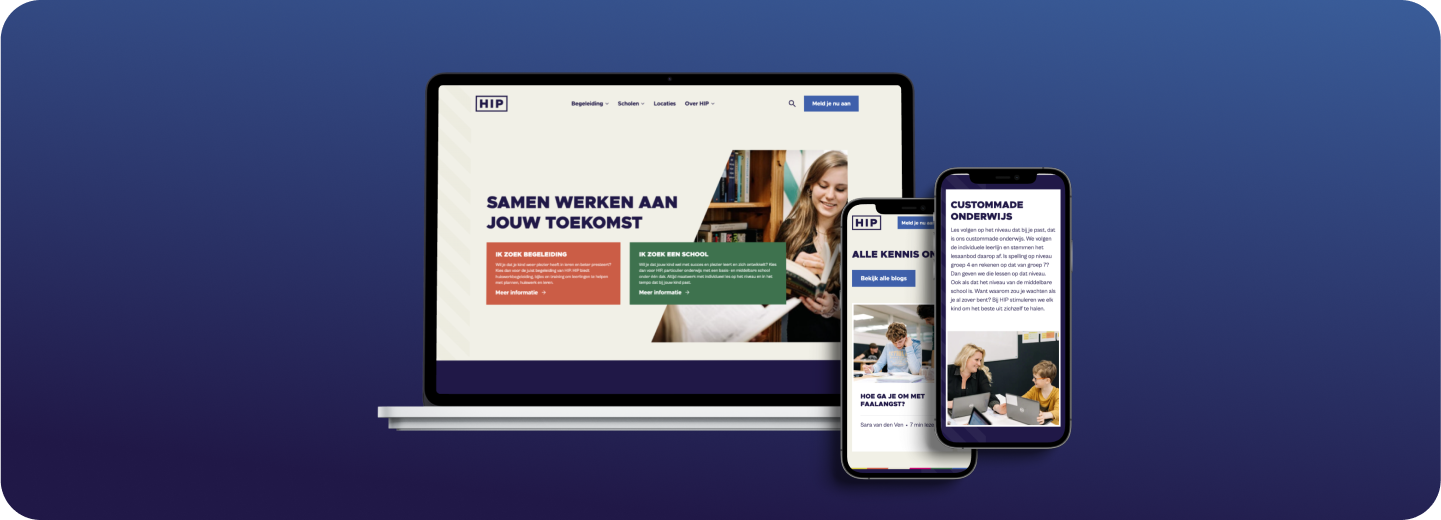 De nieuwe website moest niet alleen de diensten van HIP helder presenteren, maar ook conversiegericht werken. Daarom hebben we duidelijke CTA’s en een laagdrempelig aanmeldformulier toegevoegd. Ook hebben we custom secties ontwikkeld in samenwerking met onze SEO-specialisten, zodat HIP niet alleen inhoudelijk maar ook technisch beter scoort in zoekmachines. Met deze doordachte aanpak heeft HIP nu een futureproof website die groei ondersteunt, helder communiceert en zowel ouders als leerlingen direct de juiste weg wijst.