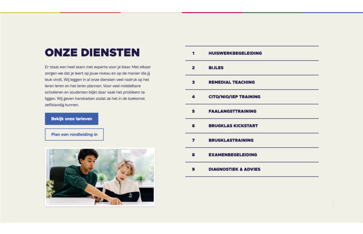 Met een focus op snelle en intuïtieve navigatie hebben we de website volledig opnieuw ingericht. Via de homepage kies je direct de richting die bij jouw vraag past: onderwijs of begeleiding.