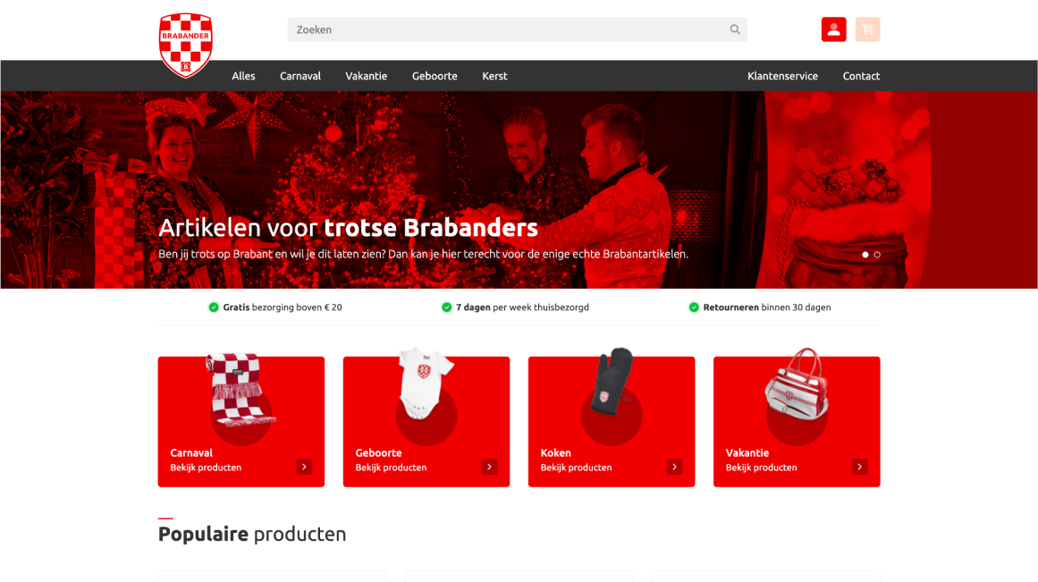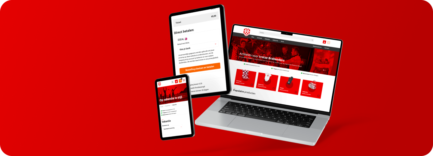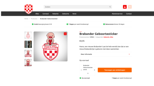 Het creëren van beleving is essentieel voor een webshop om de conversie te verhogen. De oude versie van Ikbeneenbrabander.nl kende weinig beleving. Dat moest worden toegevoegd door dichtbij het warme gevoel van Brabant te blijven met een herkenbare huisstijl. Onze designer is in samenwerking met team development de uitdaging aan gegaan. Ook moest er een koppeling worden gemaakt met een partner die het voorraadbeheer en de soepele verzending van producten realiseert.