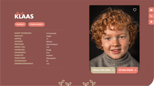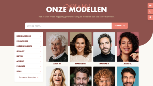 To further improve the usability of the website, we have developed the “setcard. With this feature, Frisse Koppen offers visitors an even better overview of their models. On the set card you will find additional information and photos from various photo shoots of the selected model. By manually removing several photos, you can search specifically for the ideal face for your product or service.
