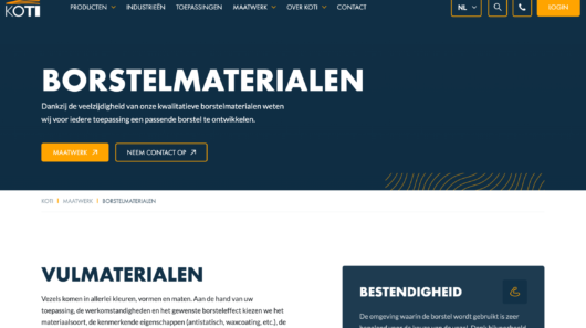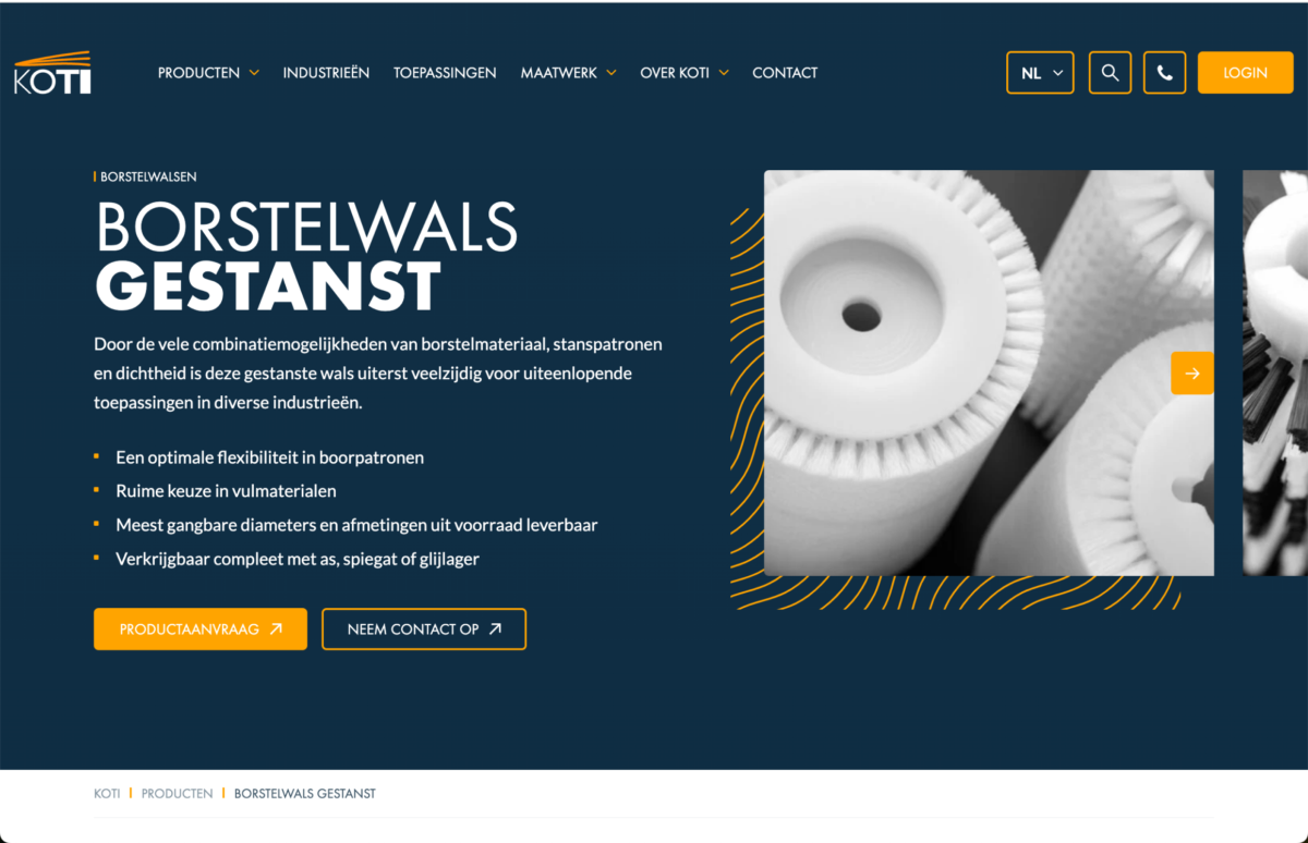The product pages are designed like a web shop, making inquiries intuitive and user-friendly. Custom request forms for each product make it even easier to contact KOTI directly. Visually, the website received an upgrade. Flexible sections, videos and micro-animations provide a modern, dynamic look. A darker color palette brings more contrast and professionalism. And corporate identity elements with a nod to brush fibers make the branding a subtle but powerful presence.